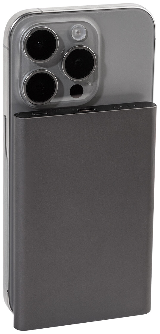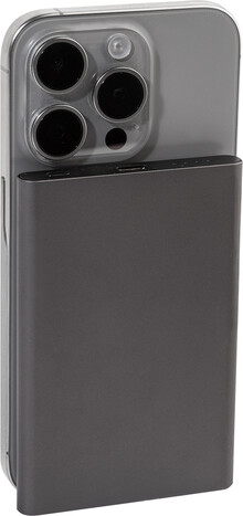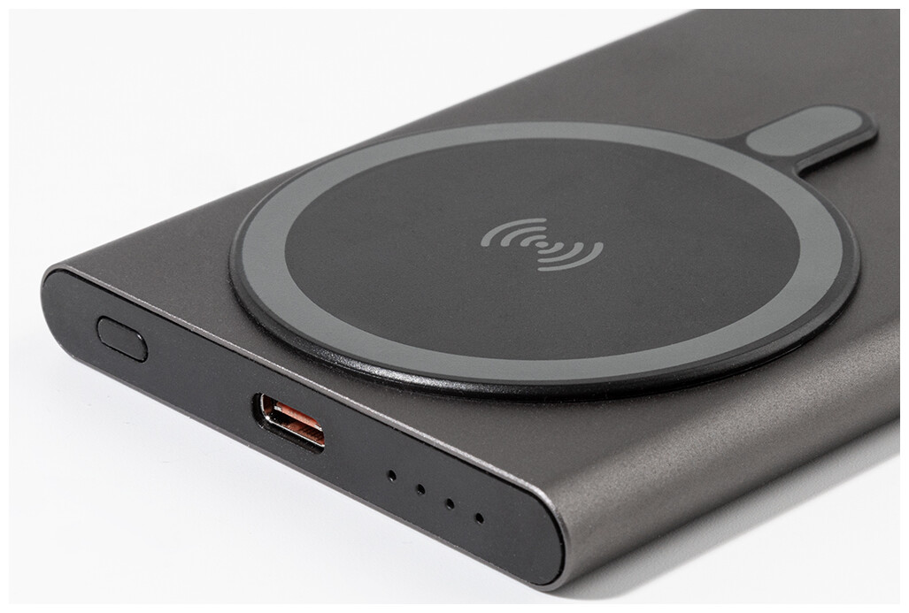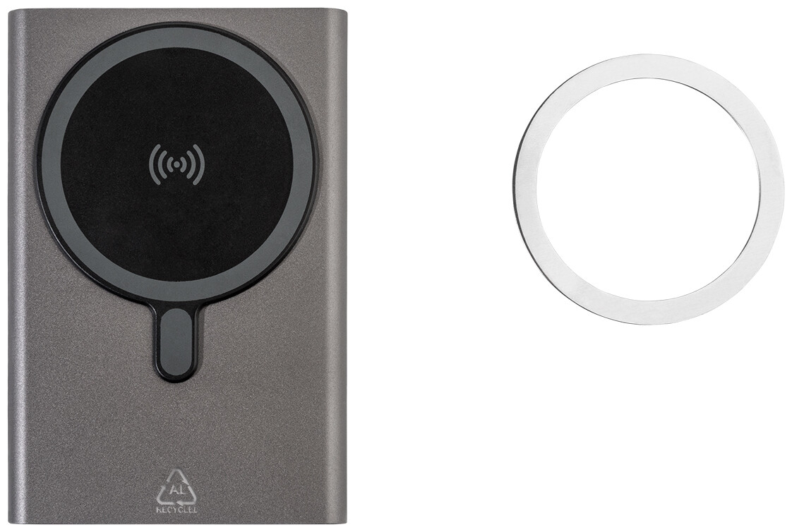 Power banka z recyklovaného hliníku s vestavěnou magnetickou bezdrátovou rychlonabíječkou (15 W) a 5000 mAh baterií. Se vstupem USB-C a portem pro nabíječku. Obsahuje samolepicí kovový kroužek pro použití magnetické funkce na jakémkoli bezdrátovém nabíjecím zařízení. Kompatibilní s iPhone® 12 nebo novějším. USB nabíjecí kabel součástí.