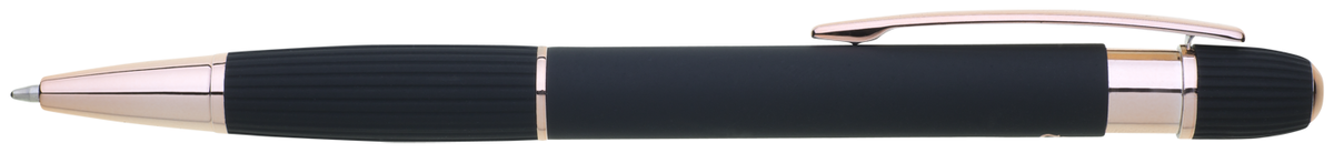 propiska z recyklovaného hliníku se soft povrchem a doplňky v růžovo-zlaté barvě. Laserované logo je lesklé, růžovo-zlaté. Náplň modře píšící. Výsledný efekt laserového značení je lesklý, v barvě doplňků.