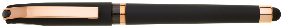 Gelová propiska s s víčkem a touch koncem, soft povrch a doplňky v růžovo-zlaté barvě. Náplň gelová velkokapacitní modře píšící.