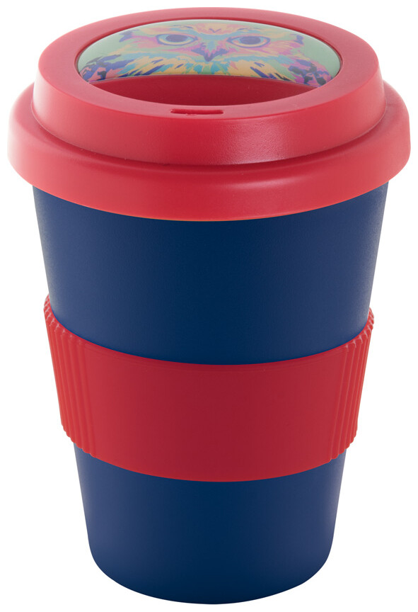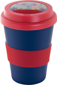 Dvoustěnný plastový termo hrnek s víčkem na pití a silikonovým úchopem na zakázku. 300 ml. Min. mn.: 50 ks.