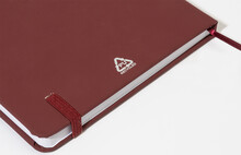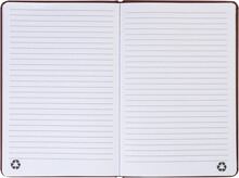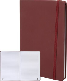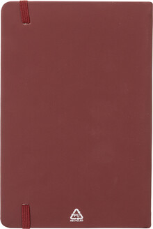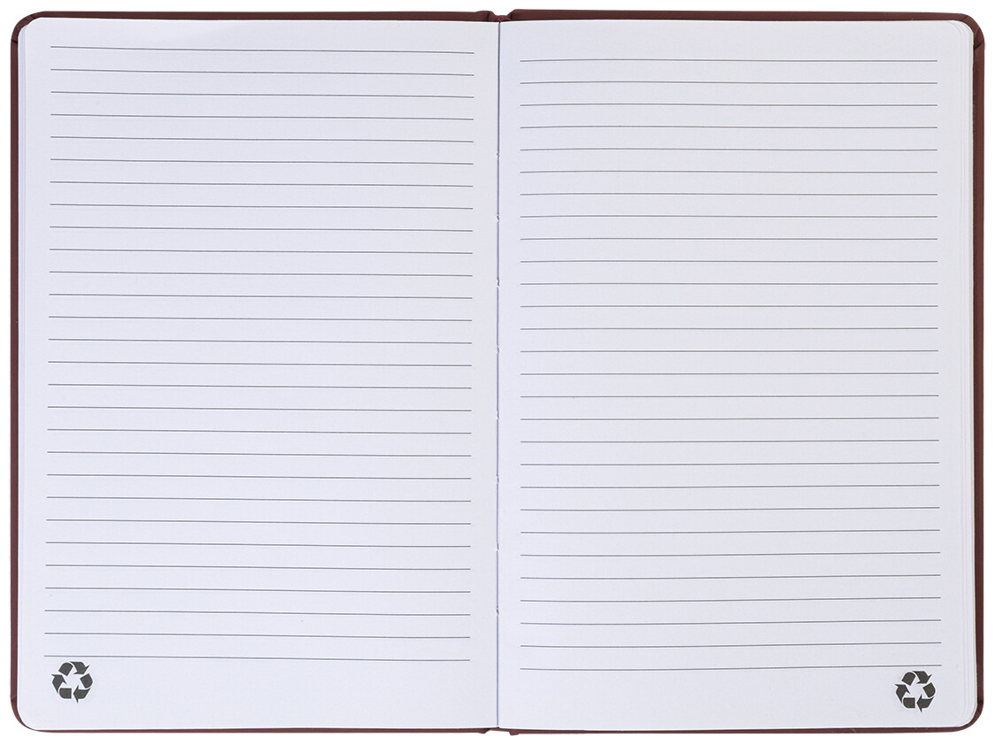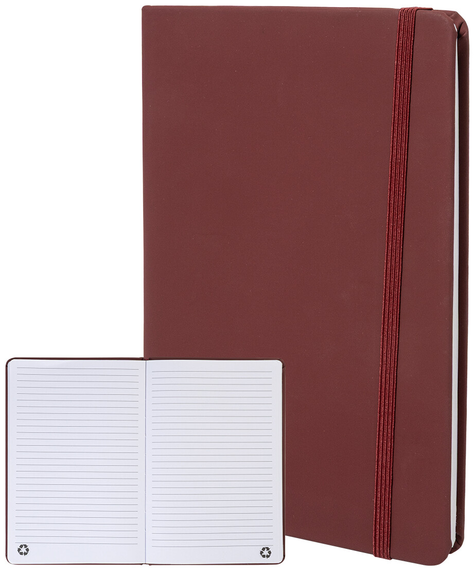 Blok potažený recyklovanou PU kůží se 100 linkovanými listy z recyklovaného papíru. Se záložkou v odpovídající barvě a gumičkou. Velikost A5.