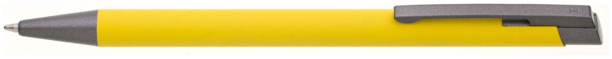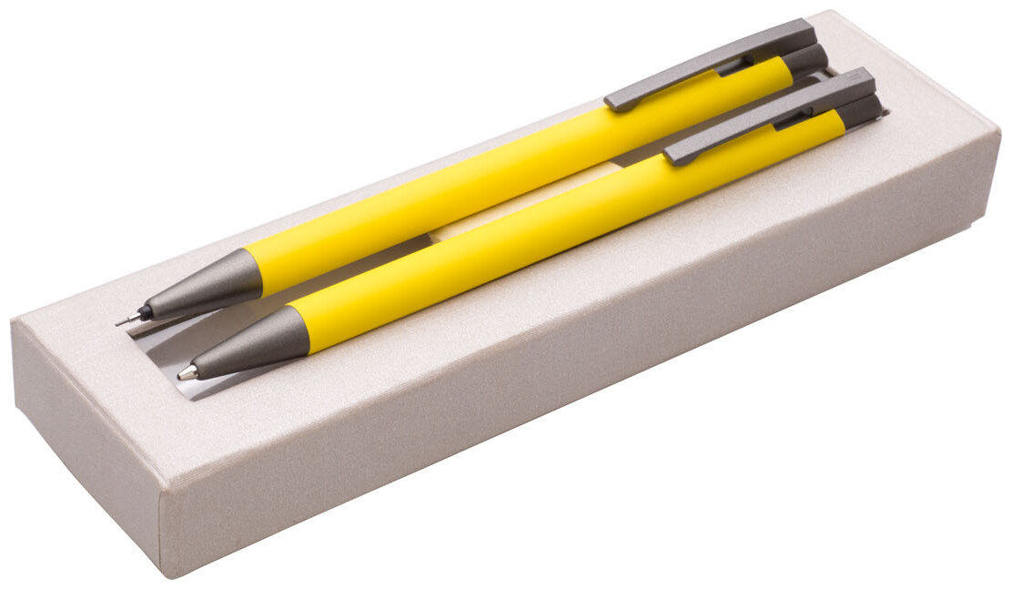 Dárková sada žluté propisky a mikrotužky s pogumovaným povrchem a šedými doplňky v luxusním dárkovém pouzdru s průhledným okénkem.