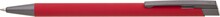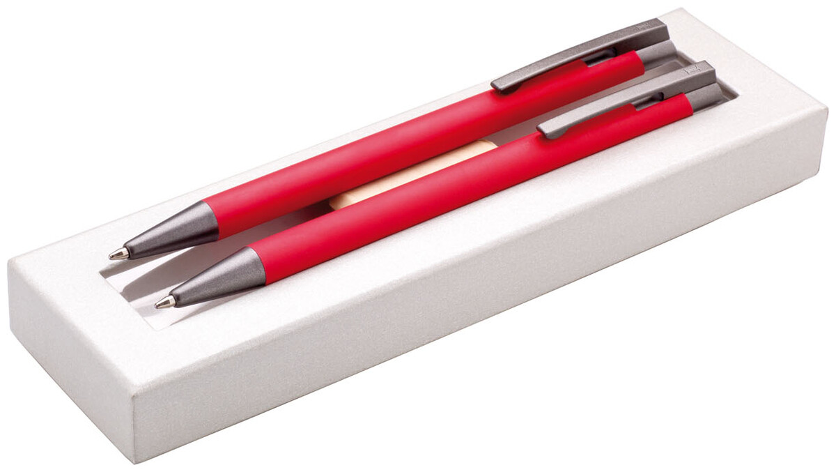 Dárková sada červené propisky a mikrotužky s pogumovaným povrchem a šedými doplňky v luxusním dárkovém pouzdru s průhledným okénkem.