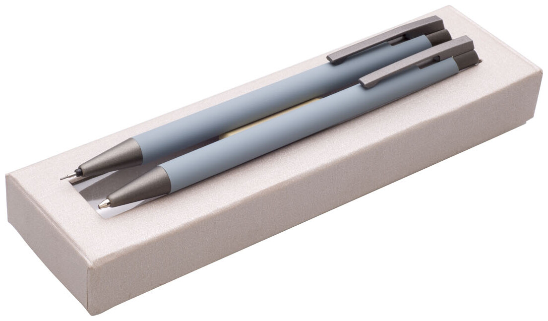 Dárková sada šedé propisky a mikrotužky s pogumovaným povrchem a šedými doplňky v luxusním dárkovém pouzdru s průhledným okénkem.