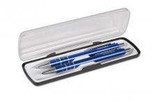 Dárková sada kuličkového pera a mechanické tužky 0,5 mm dodávaná v plastové krabičce, lesklé tělo z eloxovaného hliníku, plastová náplň A3 modrá. Barevné provedení: modré..