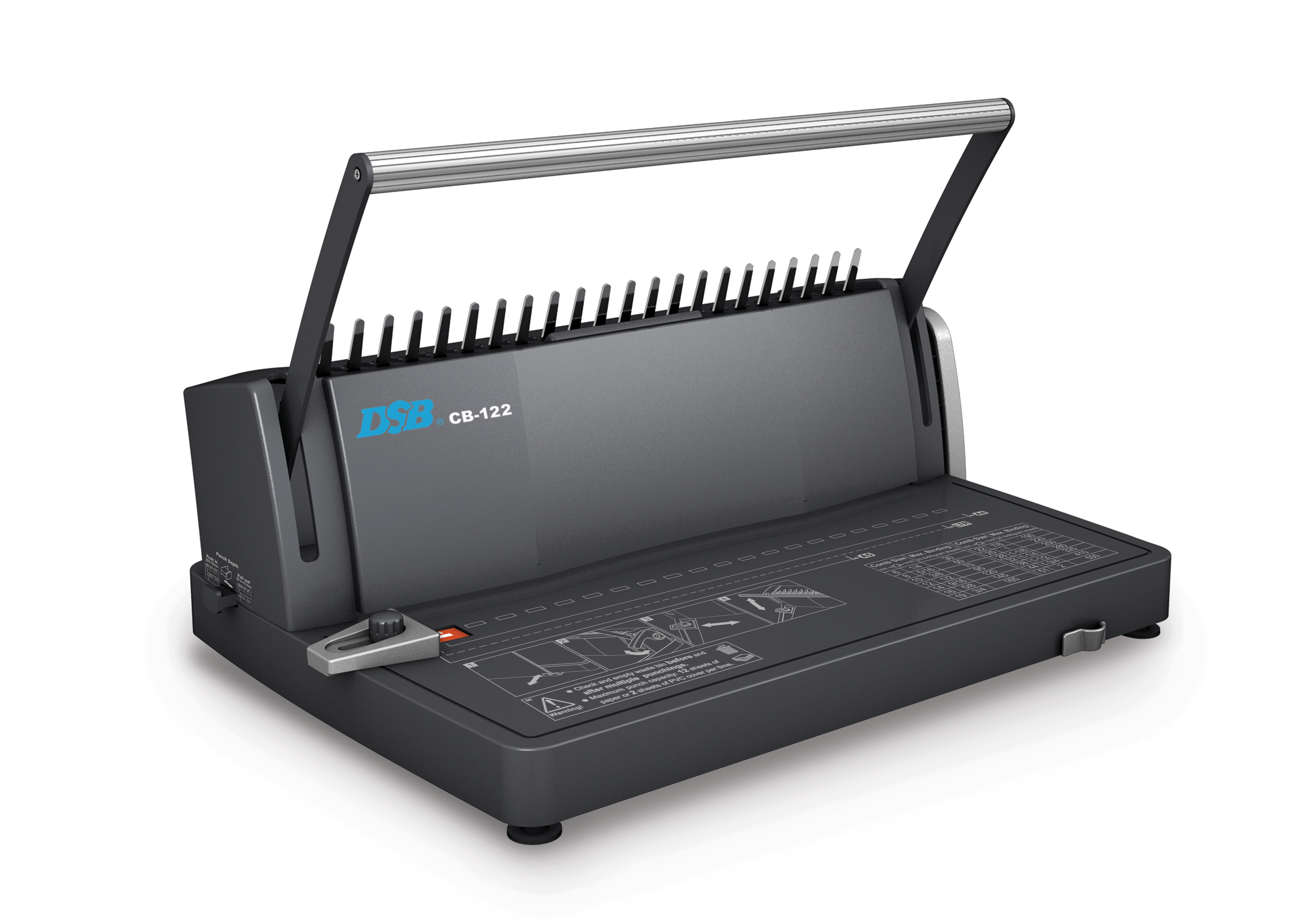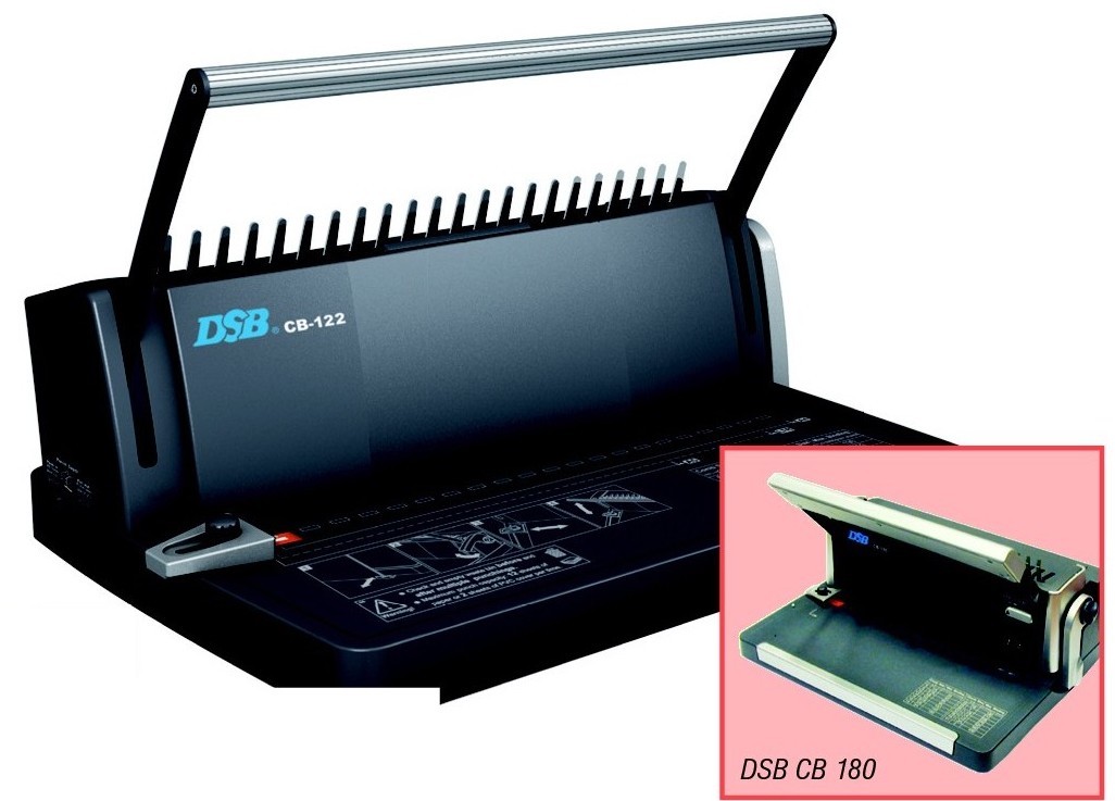 Kroužkový vazač DSB CB 122 / DSB CB 180 se samostatnou pákou pro otevírání plastových hřbetů, komfort obsluhy předurčuje tento stroj do kanceláří pro vytváření profesionálních prezentací. Nastavitelný postranní doraz a hloubka prosekávání. Odpadní zásuvka. Měřítko velikosti kroužku.