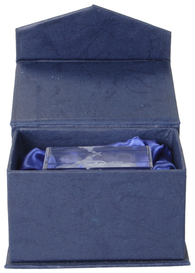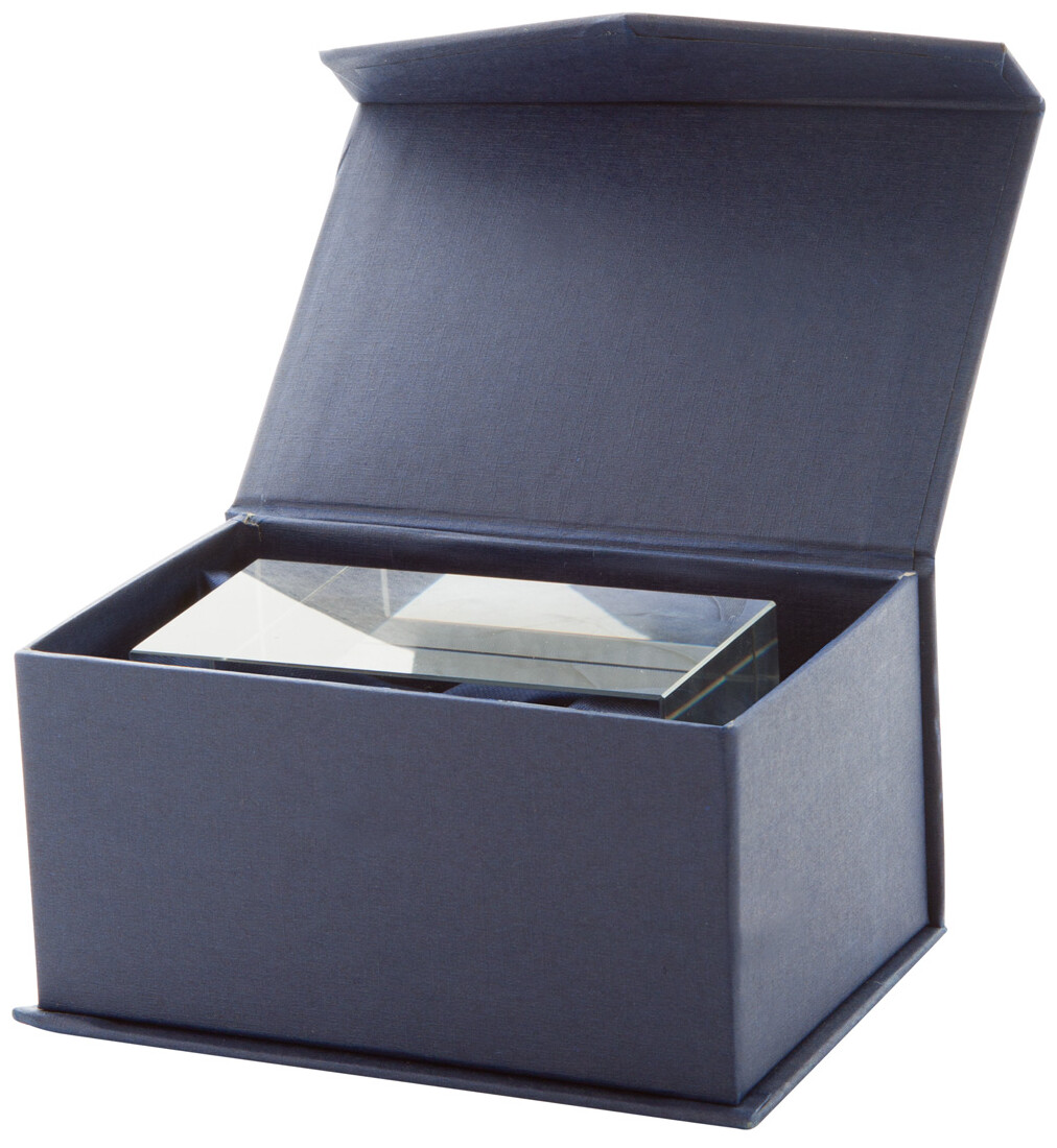 Skleněná krychle. Dodáváno v tmavomodré magnetické dárkové krabičce.