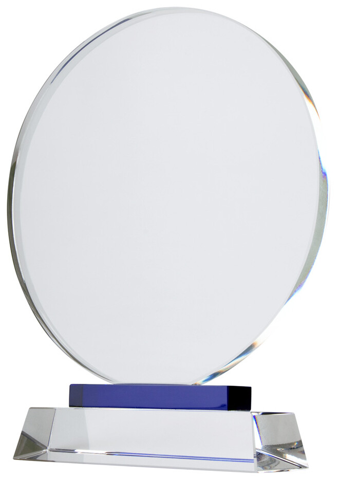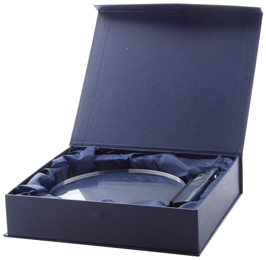 Kulatá křišťálová trofej na podstavci. Dodáváno v modré dárkové krabici s uzavíráním na magnet.