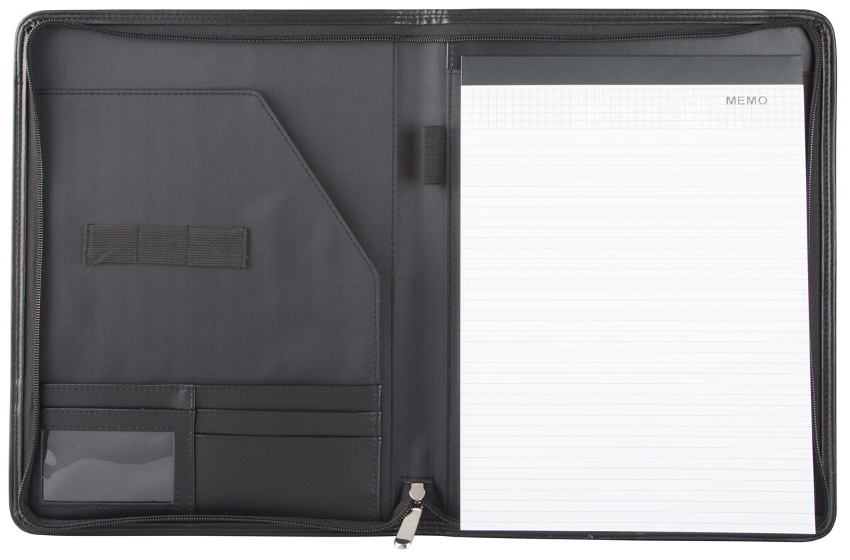 Sloha A4 na dokumenty na zip z umělé kůže s 20 listým linkovaným blokem, uchycením propisky a přihrádkou pro vizitky.