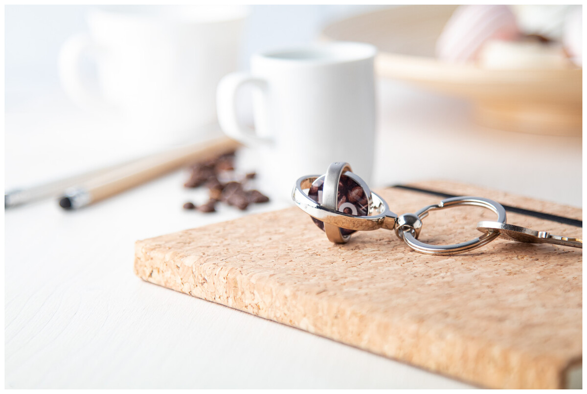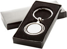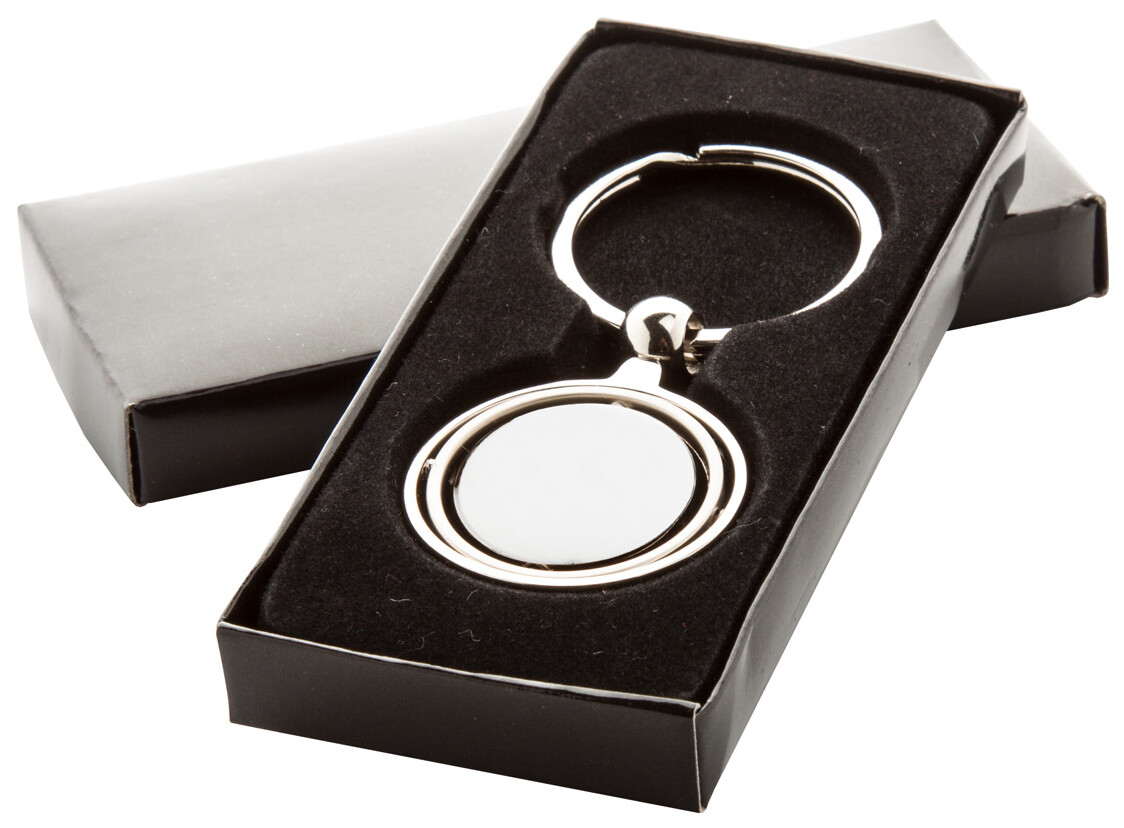 Přívěšek na klíče s otočnou vnitřní částí v černé kartonové krabičce.
