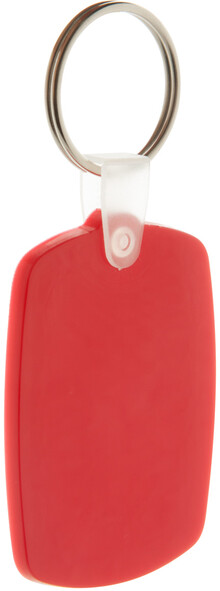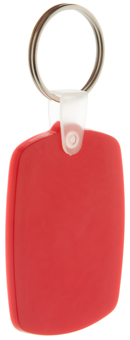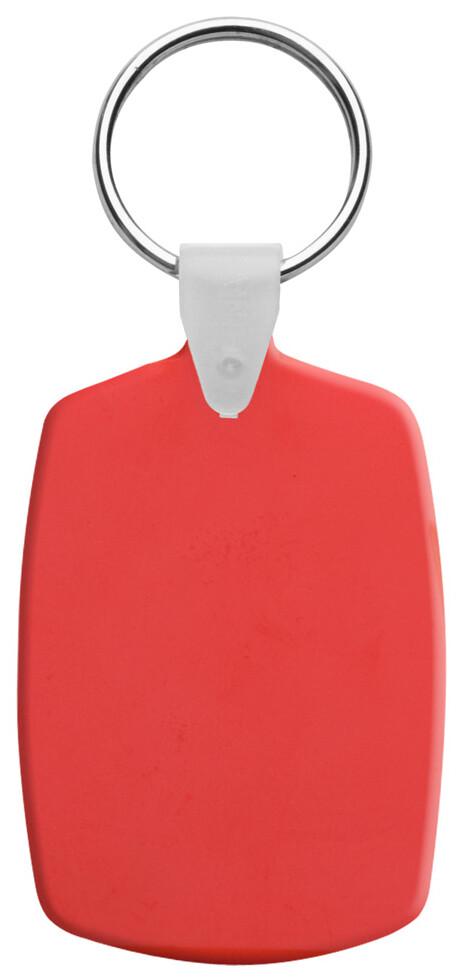 Plastový obdélníkový přívěšek na klíče s kovovým kroužkem.