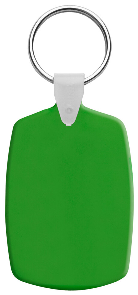 Plastový obdélníkový přívěšek na klíče s kovovým kroužkem.