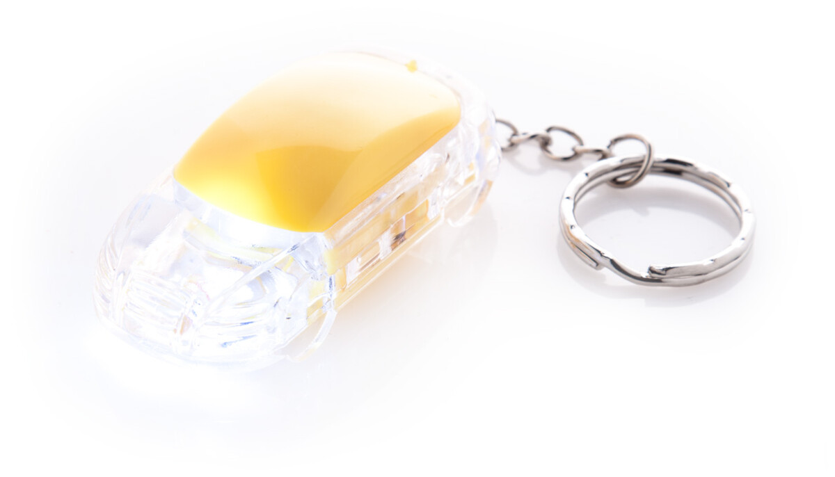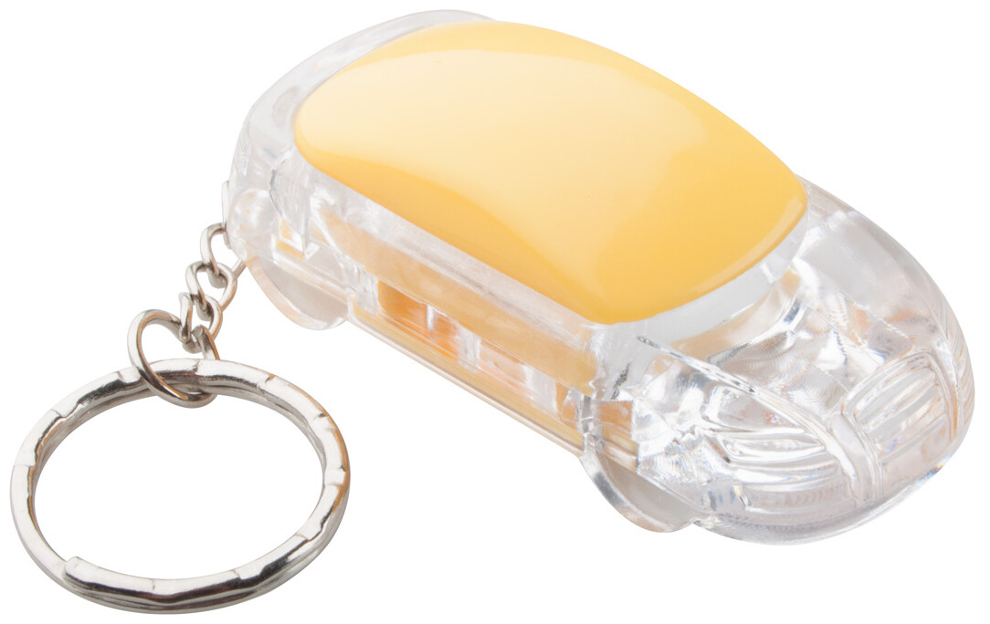 Plastový přívěšek na klíče ve tvaru auta s 1 LED diodou a kovovým kroužkem, vč. knoflíkové baterie.