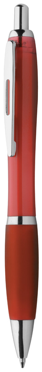 Plastové kuličkové pero s průhledným tělem, úchopem v odpovídající barvě a lesklými chromovanými částmi. S modrou náplní.
