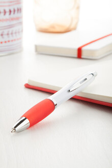 Plastové kuličkové pero s bílým tělem, barevným úchopem a lesklými chromovanými částmi. S modrou náplní.