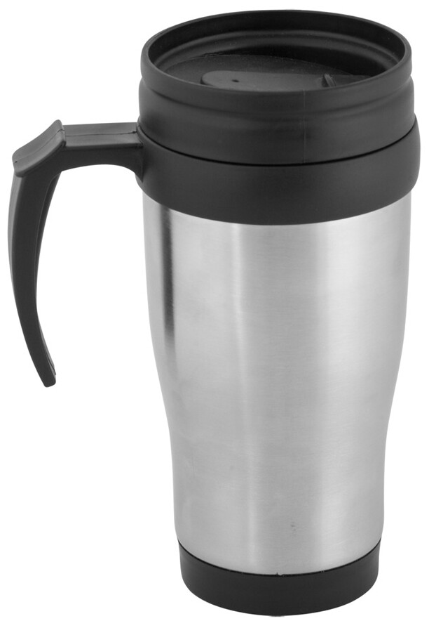 Kovový termohrnek s plastovým uchem a zavíratelným otvorem na pití ve víčku. Baleno v bílé krabičce, 450 ml.