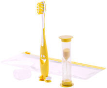 Sada na čištění zubů pro děti s plastovým kartáčkem a přesýpacími hodinami, v obalu na zip.