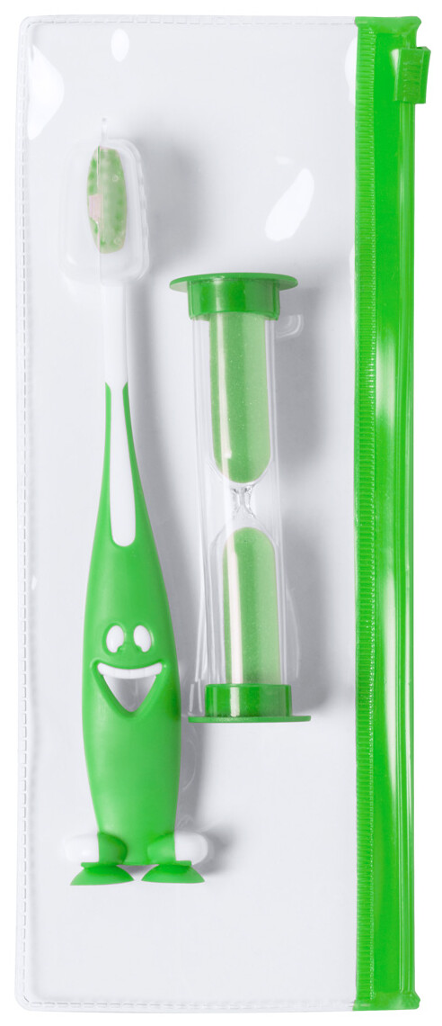 Sada na čištění zubů pro děti s plastovým kartáčkem a přesýpacími hodinami, v obalu na zip.
