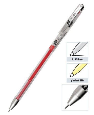 Gelové pero Silver s transparentním plastovým tělem a s vroubkovanou dolní částí pro příjemné držení. Hrot 0,38 mm Vám zajistí velmi tenkou linii psaní.
