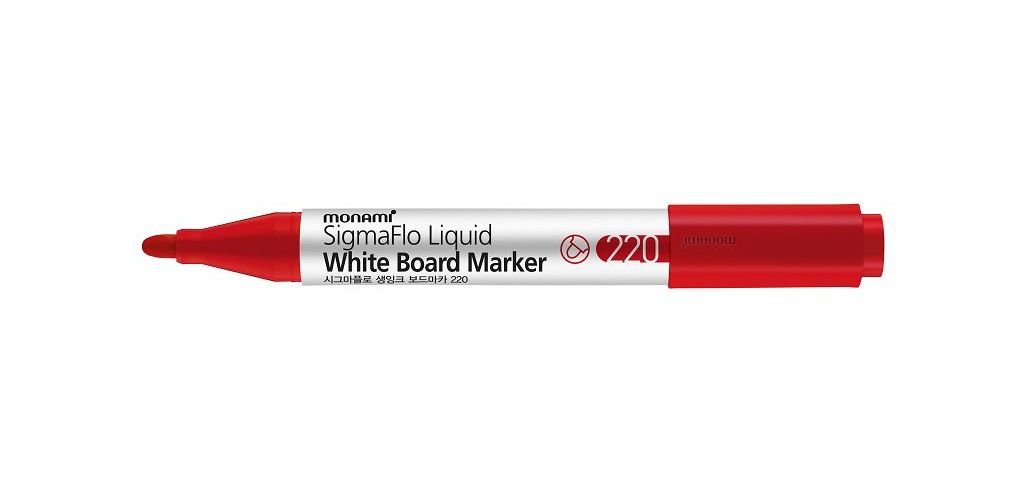 Popisovač na bílé tabule s tekutým červeným inkoustem, má až 3 x delší výdrž než běžný popisovač, lehce se maže, kulatý hrot, kulaté tělo, šíře stopy 2 mm. Výhodou tekutého inkoustu je - vizuální a sluchová kontrola stavu, inkoust - psací vlastnosti 100% do poslední kapky inkoustu jako např. u kuličkového pera - možnost nepřetrřitého psaní v jakékoliv poloze.
