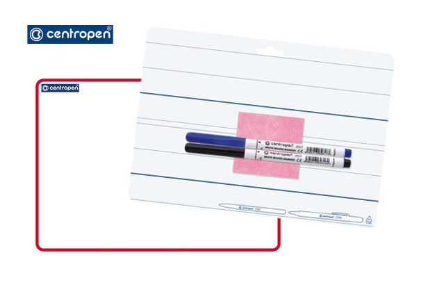 Za sucha stíratelná oboustranná tabulka A4 potažená fólií, vhodná pro prvňáčky k nácviku psaní. Součástí balení jsou i dva ks značkovače Centropen 2507 v barvách modrá a černá. Jedna strana je určena na kreslení, druhá na psaní. Na tabulce je praktický otvor pro zavěšení na zeď.