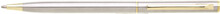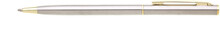 Tenká propiska s otočným mechanismem o rozměrech 130x 7,5 mm. Materiál - nerezová ocel, náplň modře píšící.