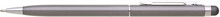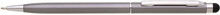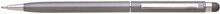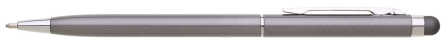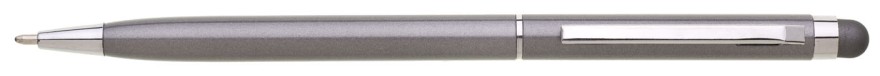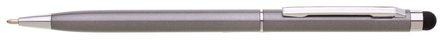 Tenká šedá kovová propiska s otočným mechanismem a touch koncem. Stříbrné, chromové doplňky, náplně cross, modře píšící. Materiál hliník.