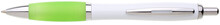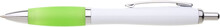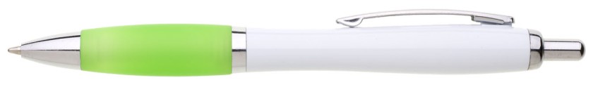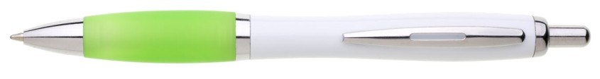 Plastové propisovací pero JESI s bílým tělem.Barva pogumovaného úchopu je světle zelená. Ostatní doplňky jsou stříbrné. Náplň je velkoobsahová, modře píšící.