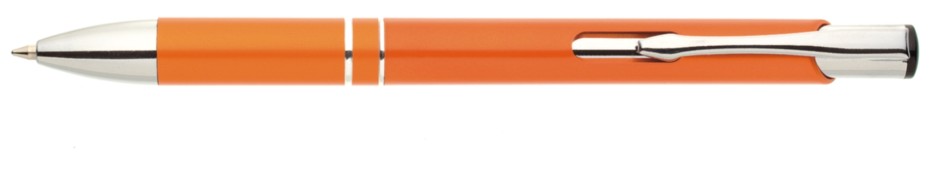 Plastové propisovací pero OIRA - oranžové . Pero je zdobené dvěma stříbrnými proužky. Na těle je zdobeno oválným výřezem. Pero má náplň velkoobsahovou, modře píšící.