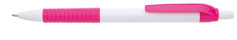 Propiska s bílým tělem, tmavě růžovým gripem a klipem, náplň modře píšící.
