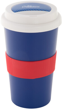 Dvoustěnný plastový termo hrnek s víčkem na pití a silikonovým úchopem na zakázku. 400 ml. Min. mn.: 50 ks.