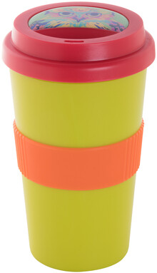 Dvoustěnný plastový termo hrnek s víčkem na pití a silikonovým úchopem na zakázku. 400 ml. Min. mn.: 50 ks.