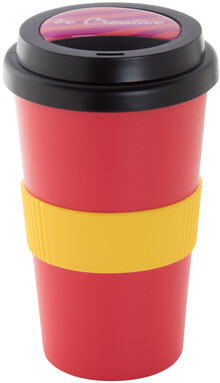 Dvoustěnný plastový termo hrnek s víčkem na pití a silikonovým úchopem na zakázku. 400 ml. Min. mn.: 50 ks.