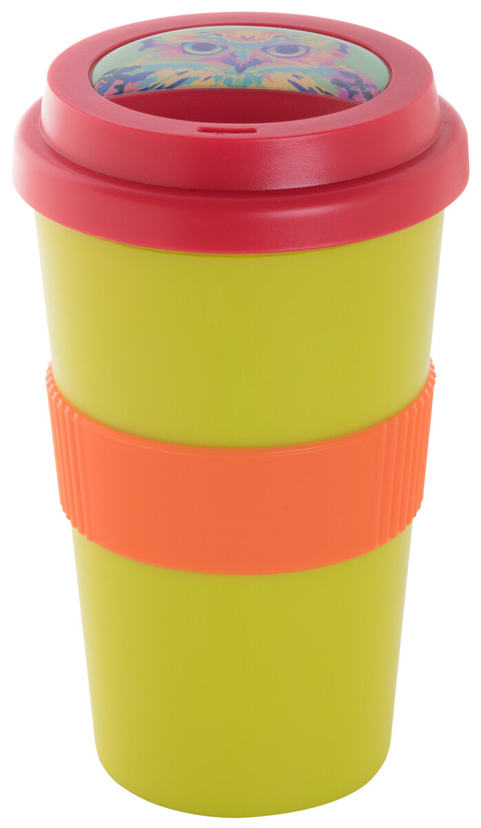 Dvoustěnný plastový termo hrnek s víčkem na pití a silikonovým úchopem na zakázku. 400 ml. Min. mn.: 50 ks.
