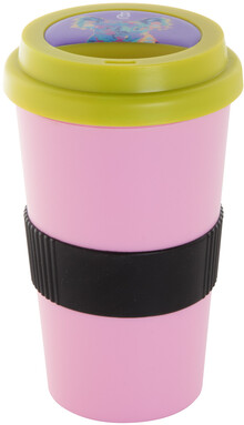 Dvoustěnný plastový termo hrnek s víčkem na pití a silikonovým úchopem na zakázku. 400 ml. Min. mn.: 50 ks.