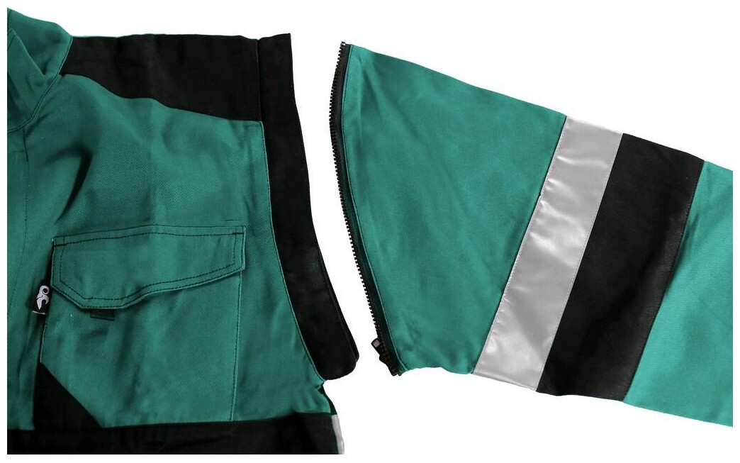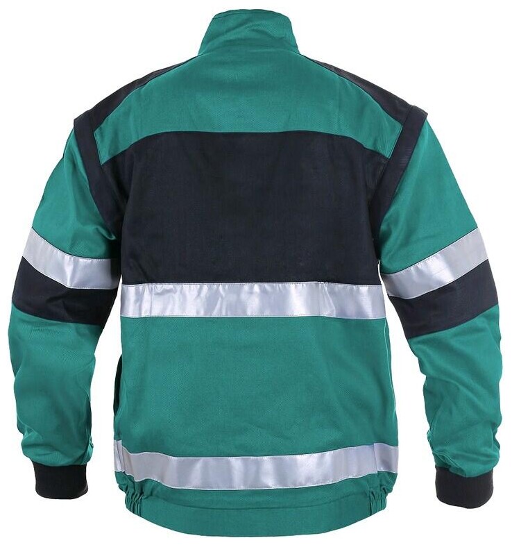 Pánská montérková blůza, odepínací rukávy s pružnou manžetou, kryté zapínání na zip a suché zipy, náprsní kapsy s klopami, skrytá náprsní kapsa na zip, jednoduché boční kapsy, pas na bocích do gumy, reflexní pruhy.