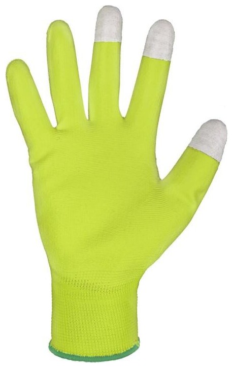 Pletené bezešvé rukavice z polyesteru, s tenkou vrstvou polyuretanu v dlani a na prstech.V koncích palce, ukazováčku a prostředníku měděné vlákno pro práci s dotykovými displeji.