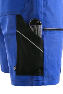Pánské montérkové kraťasy s náprsenkou, náprsní kapsa na zip, pas na knoflíky, vzadu do gumy, přední kapsy, boční kapsa na svinovací / skládací metr, boční kapsa na mobil / peněženku, zadní kapsa s klopou, šle s gumou vzadu.