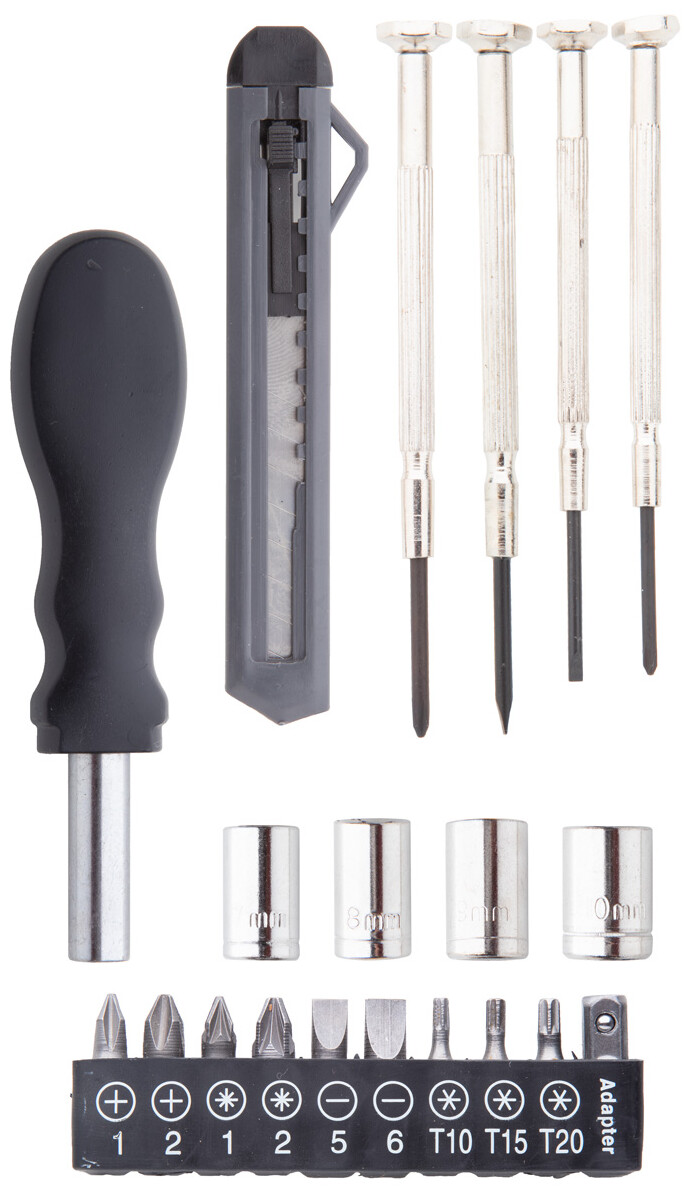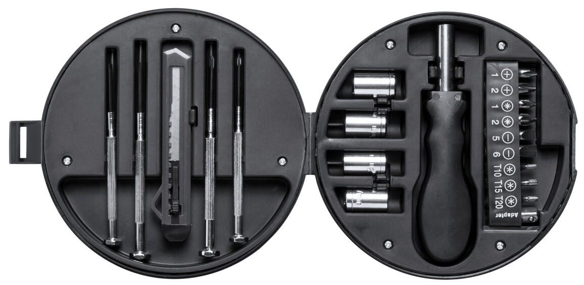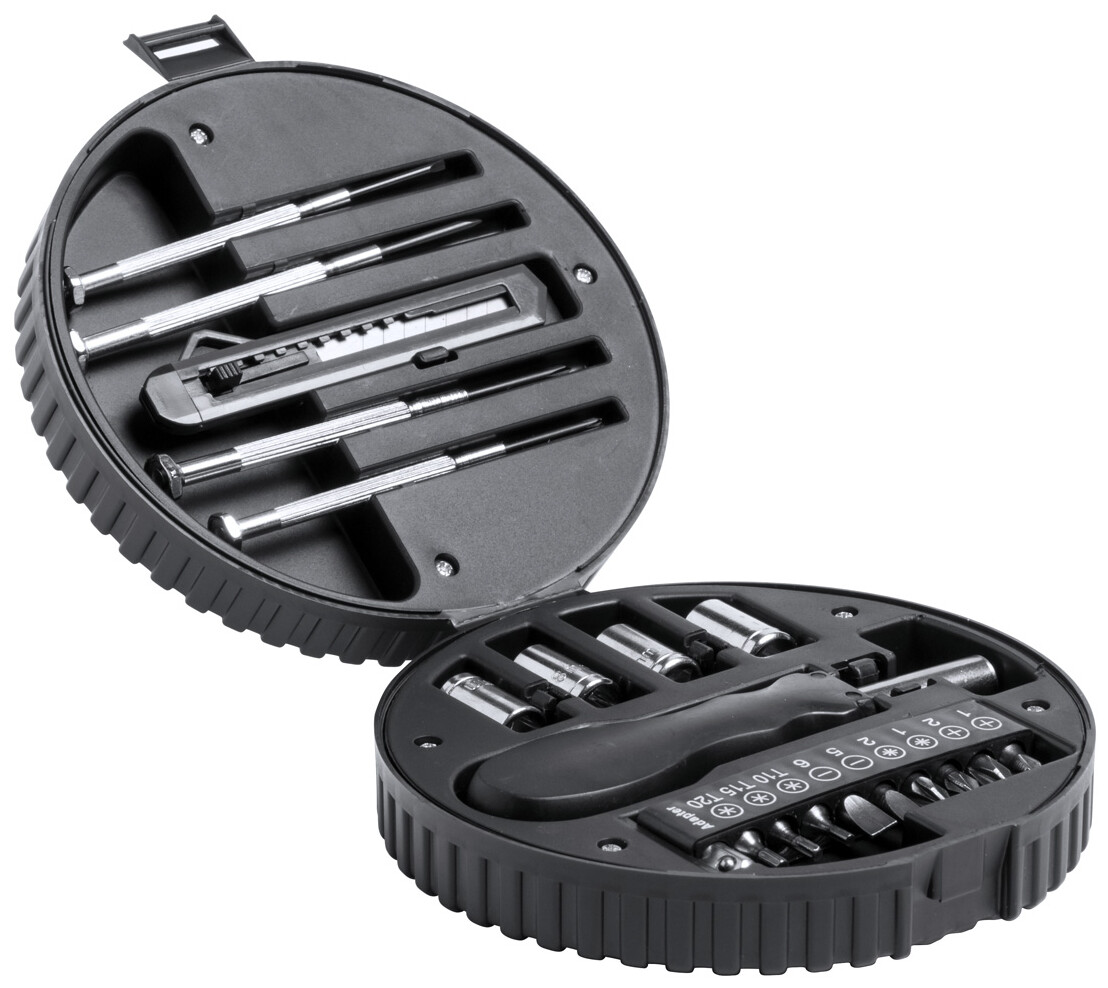Sada nářadí, 20 dílů, v plastovém obalu ve tvaru kola od auta.