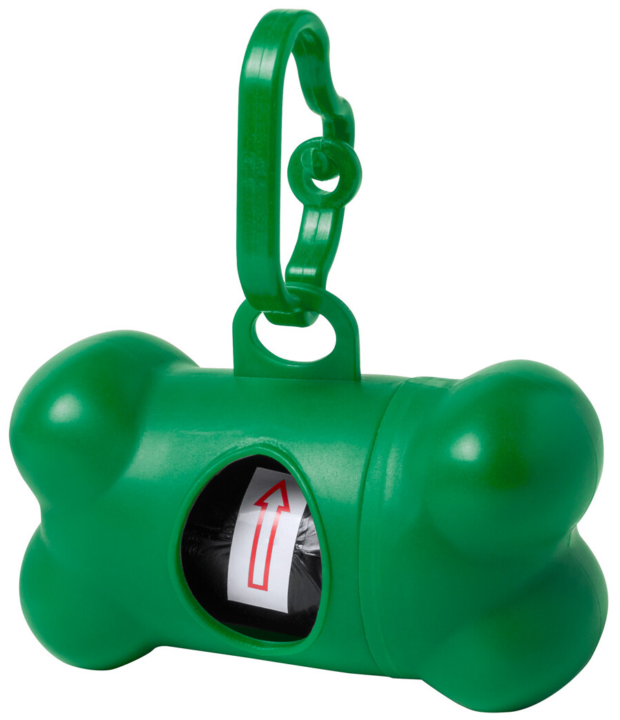 Plastový zásobník ve tvaru kosti s 15 pytlíky na psí exkrementy s karabinkou.