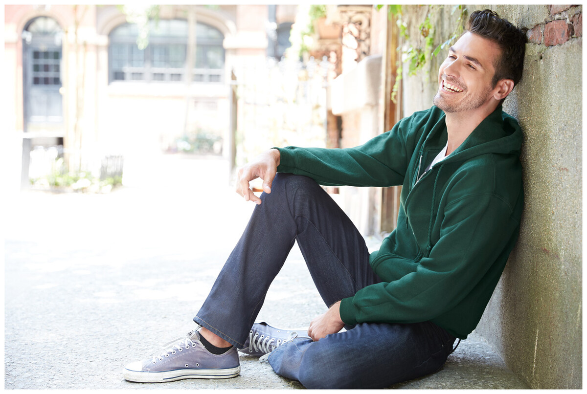 Mikina 50% bavlna / 50% polyester s kapucí, kovovým zipem a předními kapsami, 271 g/m2 (bílá 257 g/m2). Produkt značky Gildan.