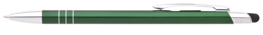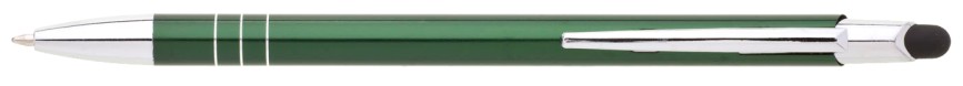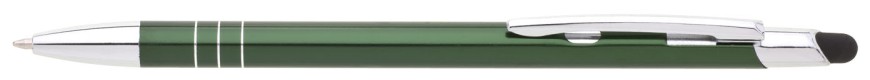 Tenká kovová propiska SOTTI s touch koncem v tmavězelené barvě s chromovými doplňky a třemi tenkými proužky. Náplň X-20, modře píšící.