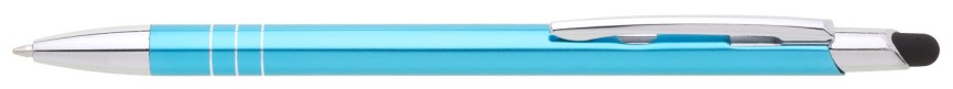 Tenká kovová propiska SOTTI s touch koncem v tyrkysové barvě s chromovými doplňky a třemi tenkými proužky. Náplň X-20, modře píšící.