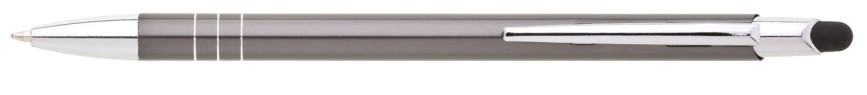 Tenká kovová propiska SOTTI s touch koncem v šedé barvě s chromovými doplňky a třemi tenkými proužky. Náplň X-20, modře píšící.