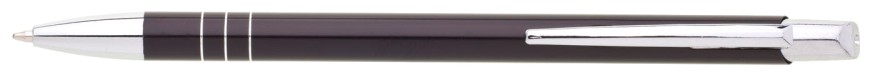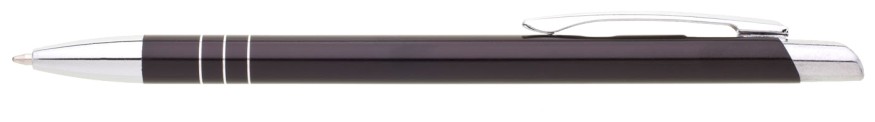Tenká kovová propiska SOTTI v černé barvě s chromovými doplňky a třemi tenkými proužky. Náplň X-20, modře píšící.
