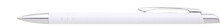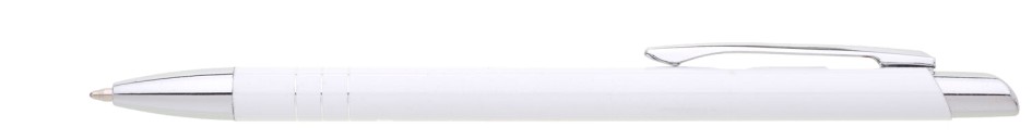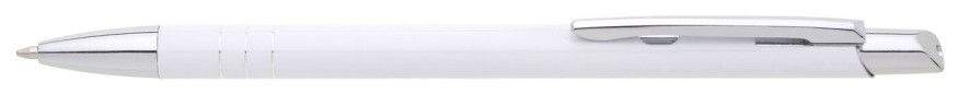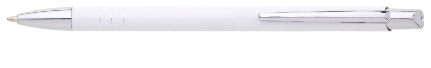 Tenká kovová propiska SOTTI v bílé barvě s chromovými doplňky a třemi tenkými proužky. Náplň X-20, modře píšící.