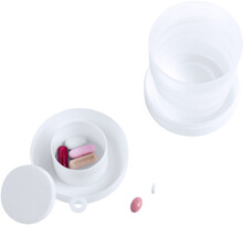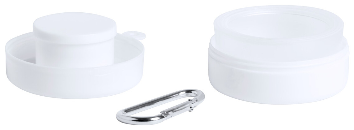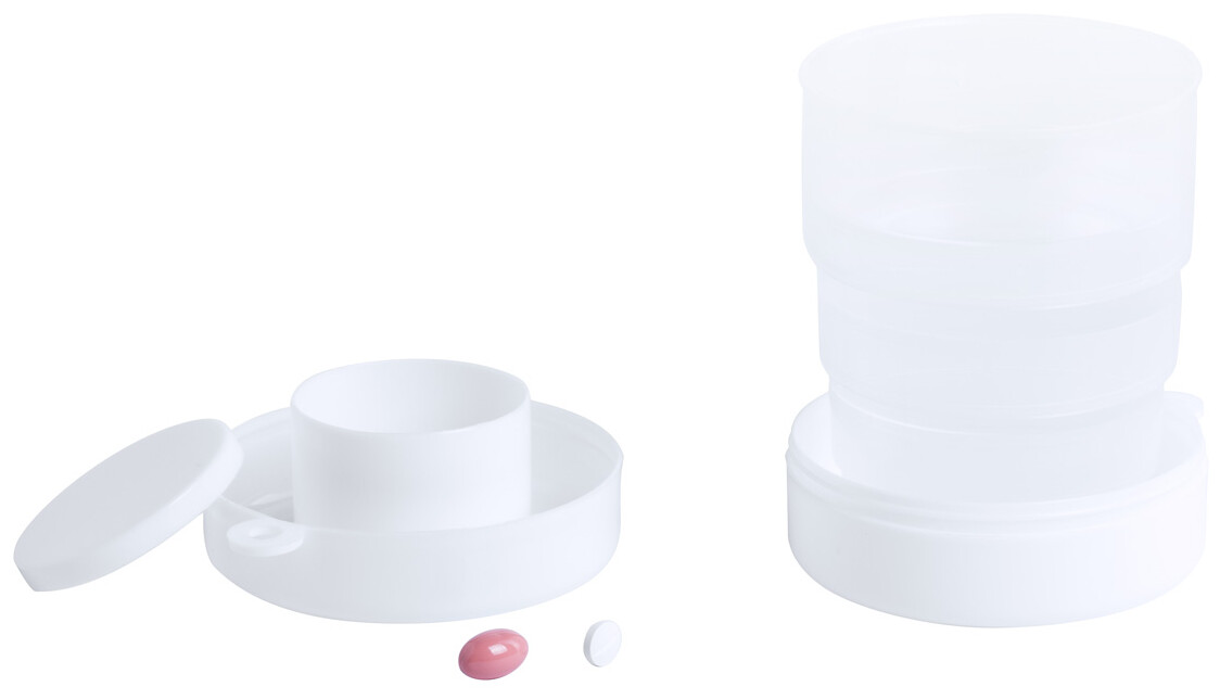 Plastový skládací pohárek s boxem na pilulky. Pouzdro s karabinkou, 220 ml.