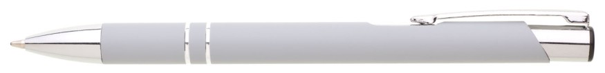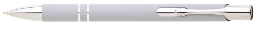 Hliníková propiska se stříbrnými doplňky a měkkým pogumovaným soft povrchem v šedé barvě. Modře píšící.
