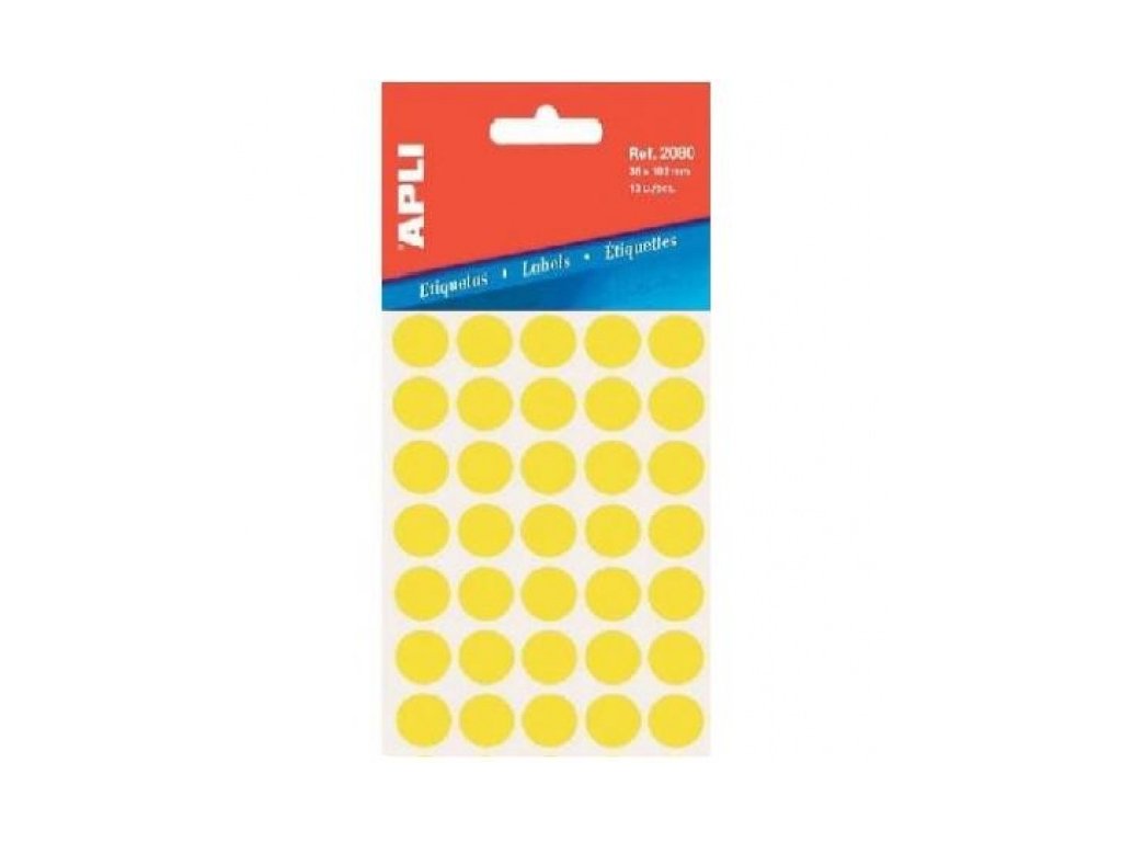 Malé balení kulatých, barevných etiket, 5 listů 16 x 8,5 cm. Průměr: 13 mm, barva: žlutá, 176 etiket.