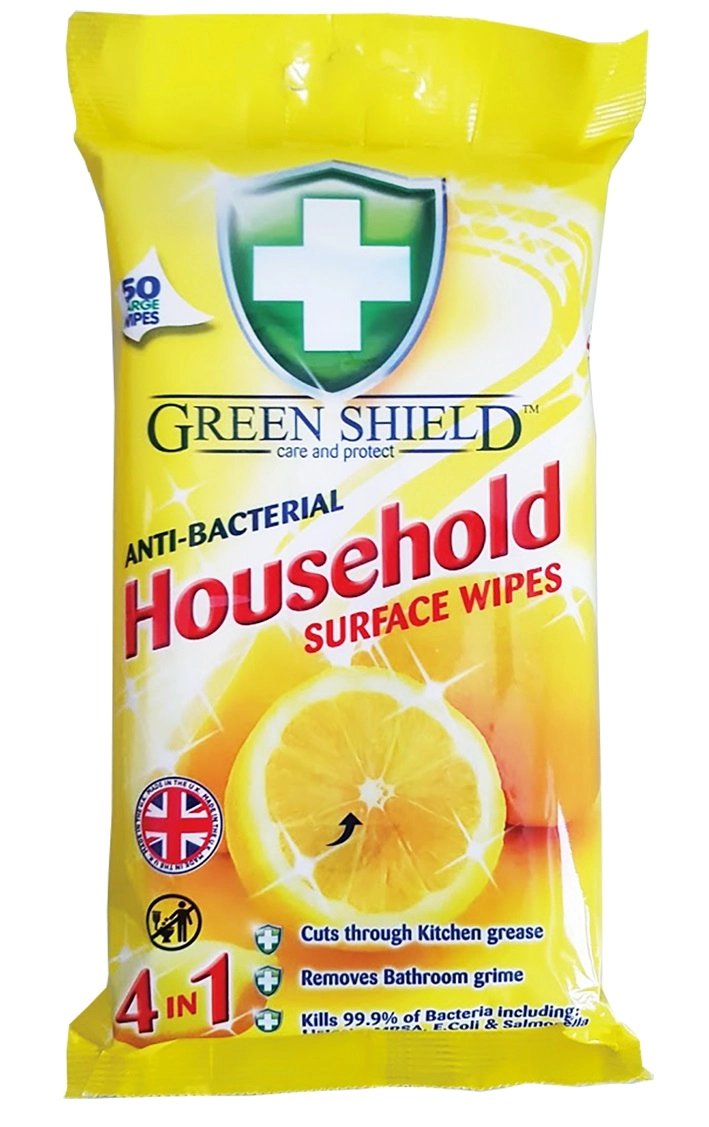 Green Shield vlhčené utěrky jsou antibakteriální ubrousky pro domácí použití, určené hlavně do kuchyně a koupelny. Rychle odstraňují mastnotu a běžné nečistoty a zanechávají svěží citronovou vůni. Balení obsahuje 50 kusů.